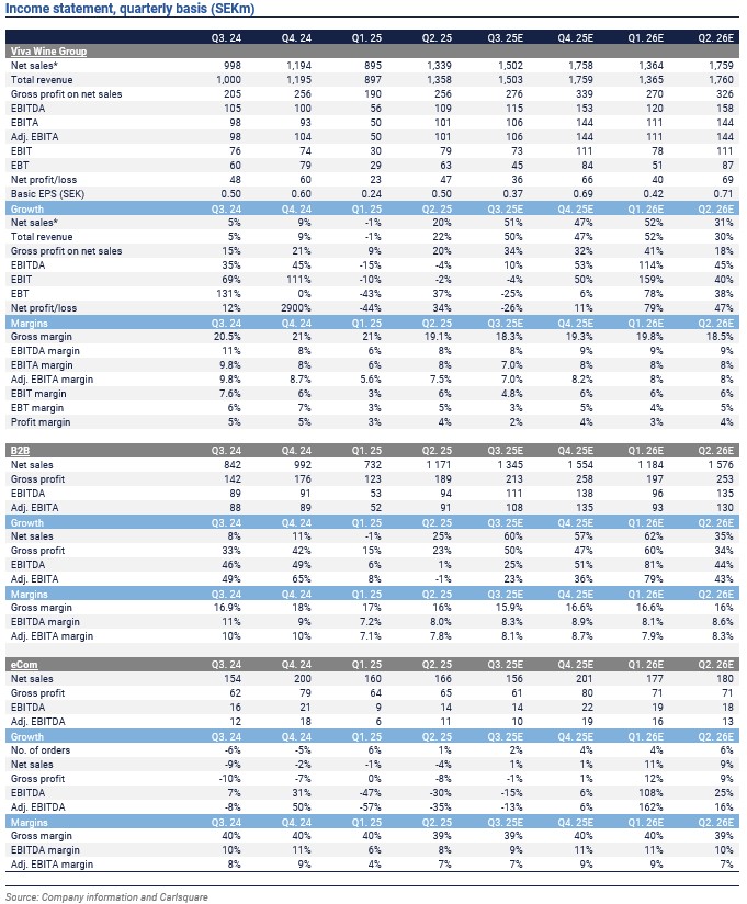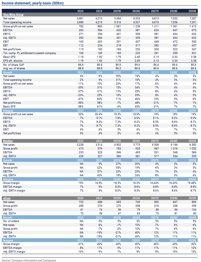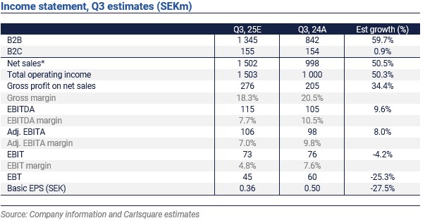 - The acquisition of Delta Wines will significantly boost sales (we assume some 49 per cent) and also contribute to an overall earnings increase, we believe. The positive impact was partly visible in Q2 2025, with sales and EBITA contributions of SEK 233m and SEK 9m, respectively. However, for the Nordics B2B operations and the B2C segment, we expect lower profitability year over year due to sluggish volumes and higher OPEX. For the group, we expect an adjusted EBITA of SEK 106m (98), corresponding to a margin of 7.0% (9.8).