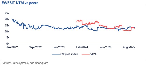 - We believe that Viva Wine Group has strengthened its position through organic growth and acquisitions in recent times and is well placed to continue to outperform its target markets over time. With the previous valuation premium compared to peers now apparently gone (see below), it suggests good rerating potential when the market shows signs of recovery, barring any unexpected setbacks related to, e.g., the integration of Delta Wines.