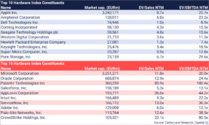 Although the hardware sector has performed better since reaching a low point in 2017, it has been significantly outperformed by software companies. Since 2014, the value of software company shares has increased fivefold, whereas the value of hardware company shares has “only” increased twofold.