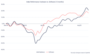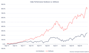Although the hardware sector has performed better since reaching a low point in 2017, it has been significantly outperformed by software companies. Since 2014, the value of software company shares has increased fivefold, whereas the value of hardware company shares has “only” increased twofold.