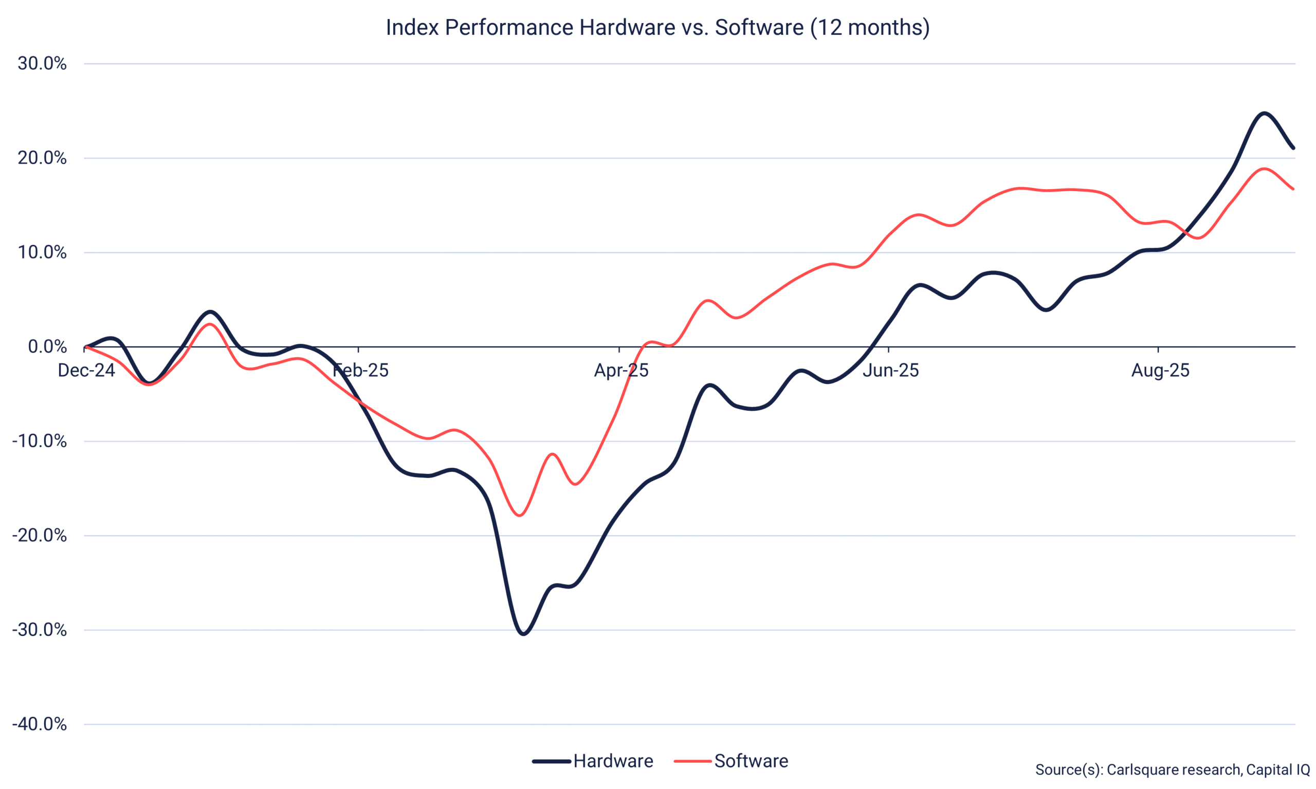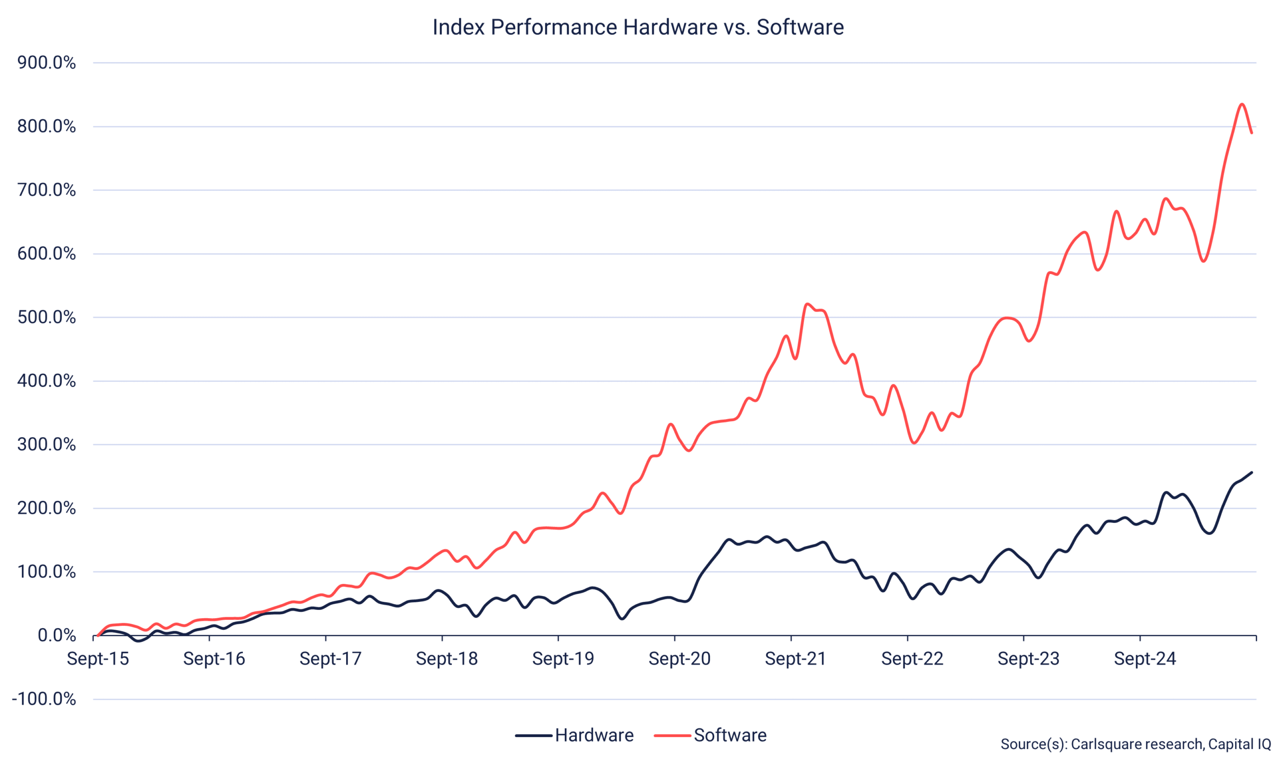 Zooming in on performance over the last year, we can see that hardware companies are actually outperforming software companies on the stock market. Although the margin is slight, we believe there is a reason for this trend to continue.