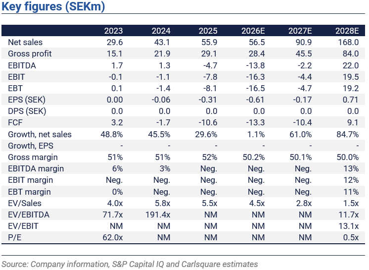 In Q1 2026, net sales came in at SEK 7.1m, down 56% YoY. This was also undoubtedly below our forecast of SEK 15.1m, implying negative growth of around 7%. Gross margin was 49.6%, broadly in line with what we see as a normalised level. A new initiative in Sweden weighed on OPEX, which totalled SEK 10.5m, and EBIT came in at SEK -7.0m (vs our forecast of SEK -0.5m). We estimate FCF in Q1 at SEK -9.9m, while cash at quarter-end stood at SEK 10.7m.