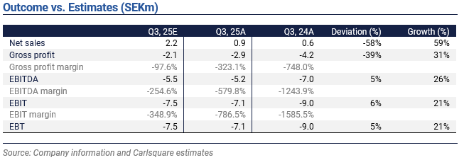 - The net result for Q3 2025 amounted to minus SEK 7.1 million, compared to our estimate of minus SEK 7.5 million.