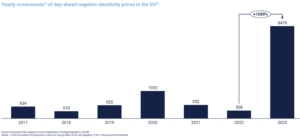 Yearly occurrences of day-ahead negatice electricity prices in the EU