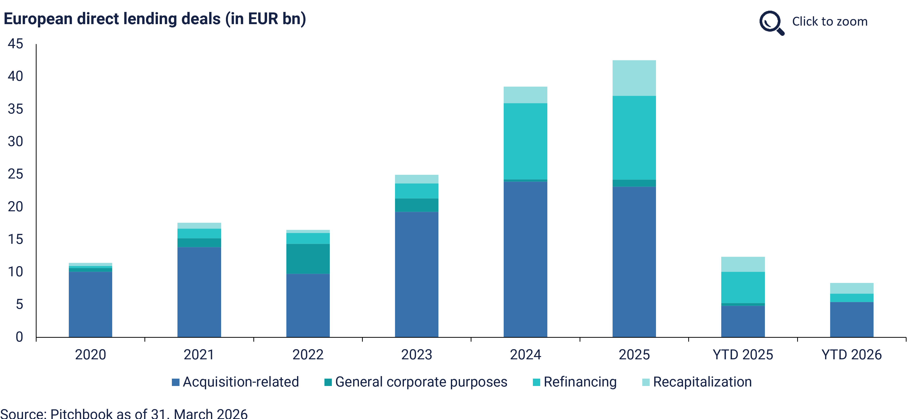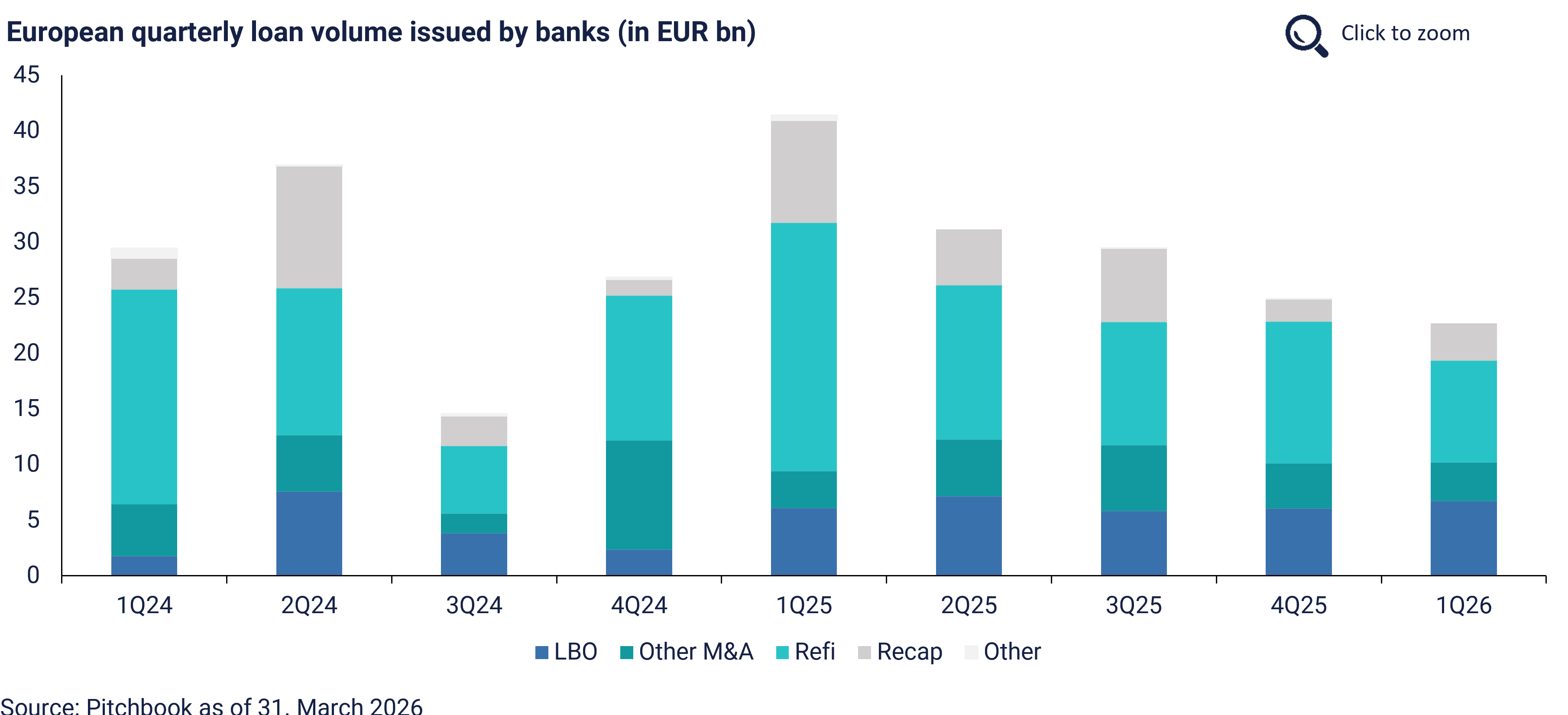 European leveraged loan issuance declined to EUR 22.7bn, the lowest first-quarter total since 2023, with geopolitical tensions and stagflation fears weighing on market activity. Direct lending volume fell 33% YoY to EUR 8.3bn across 35 transactions. M&A activity remained subdued but showed early signs of recovery at EUR 10.2bn.