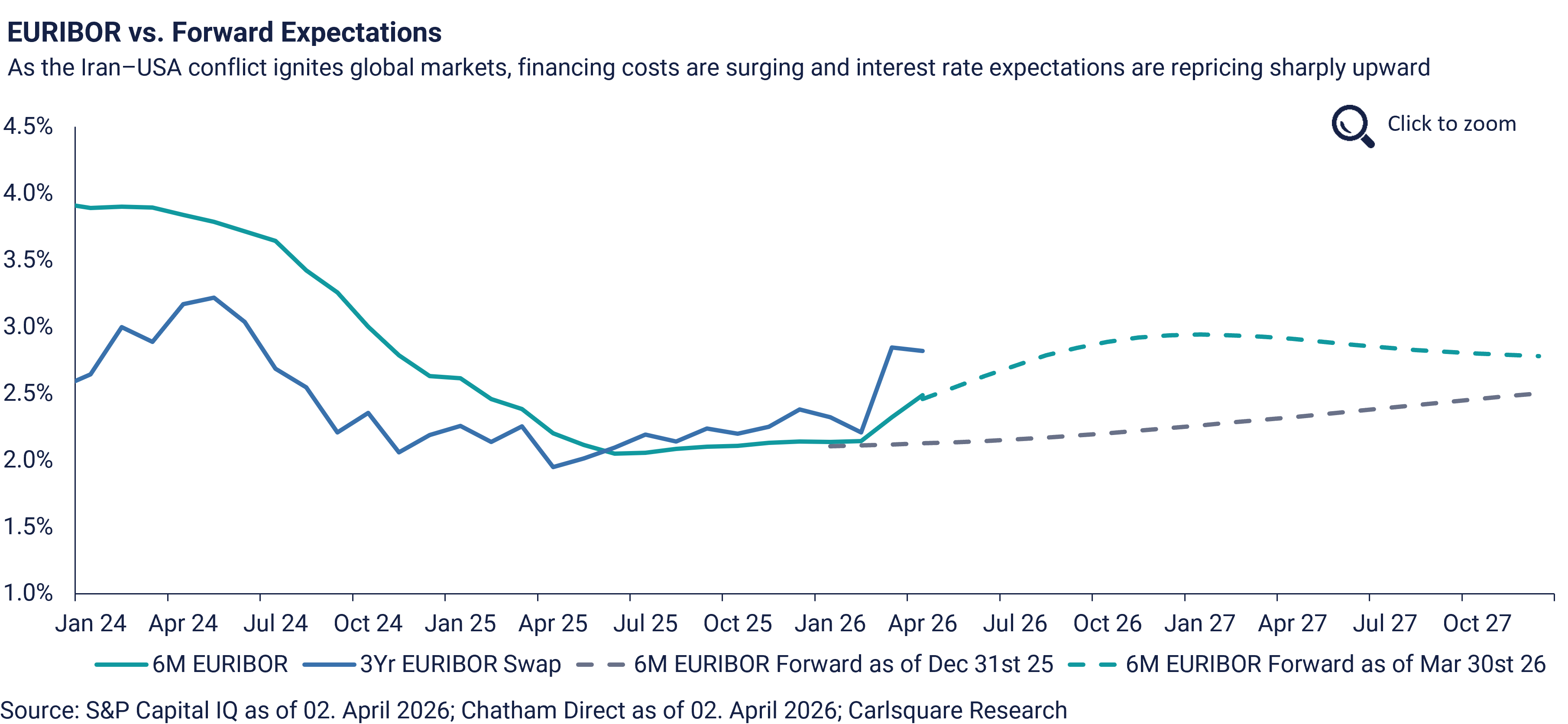 The ECB held rates unchanged at their latest meeting in March at 2.0% since June 2025 but warned equally that soaring energy prices due to ongoing war in Ukraine and newly outbreak of the Iran war would have a material impact on inflation. The ECB is expecting the inflation rate to be at 2.6% for this year compared to a previous estimate of 1.9% in December 2025. Likewise, the Bank of England decided in their most recent meeting to keep the interest rate steady at 3.75%. As illustrated in the Carlsquare Euribor vs. Forward Expectations chart, a comparison of forward curves at end-2025 and end-March 2026 reveals that markets have already priced in close to 80 bps of near-term risk with three interest rate hikes this year, reflecting a notable increase in uncertainty among market participants.