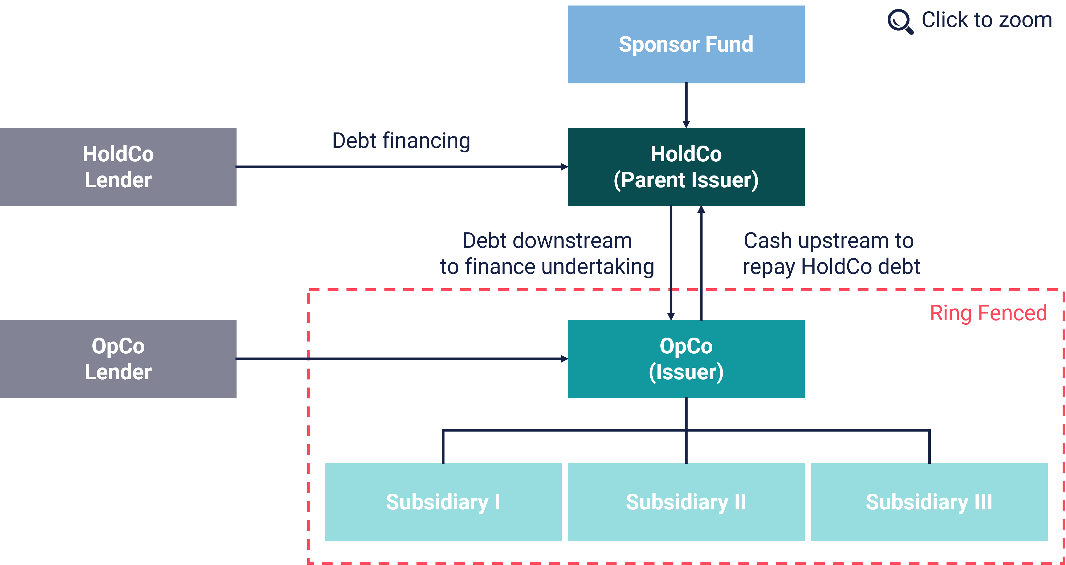 In HoldCo financing structures, the debt is lent to a holding company (“HoldCo”) that sits typically one layer above the operating entity (“OpCo”) and which is then down-streamed as cash injection to the OpCo. This lending does not cause any complications for the OpCo since the credit documentation allows it and the financial metrics and maintenance covenants are not affected by the new lending to the HoldCo. The repayment of the debt effectively relies on upstream distributions from the operating business or on exit proceeds.