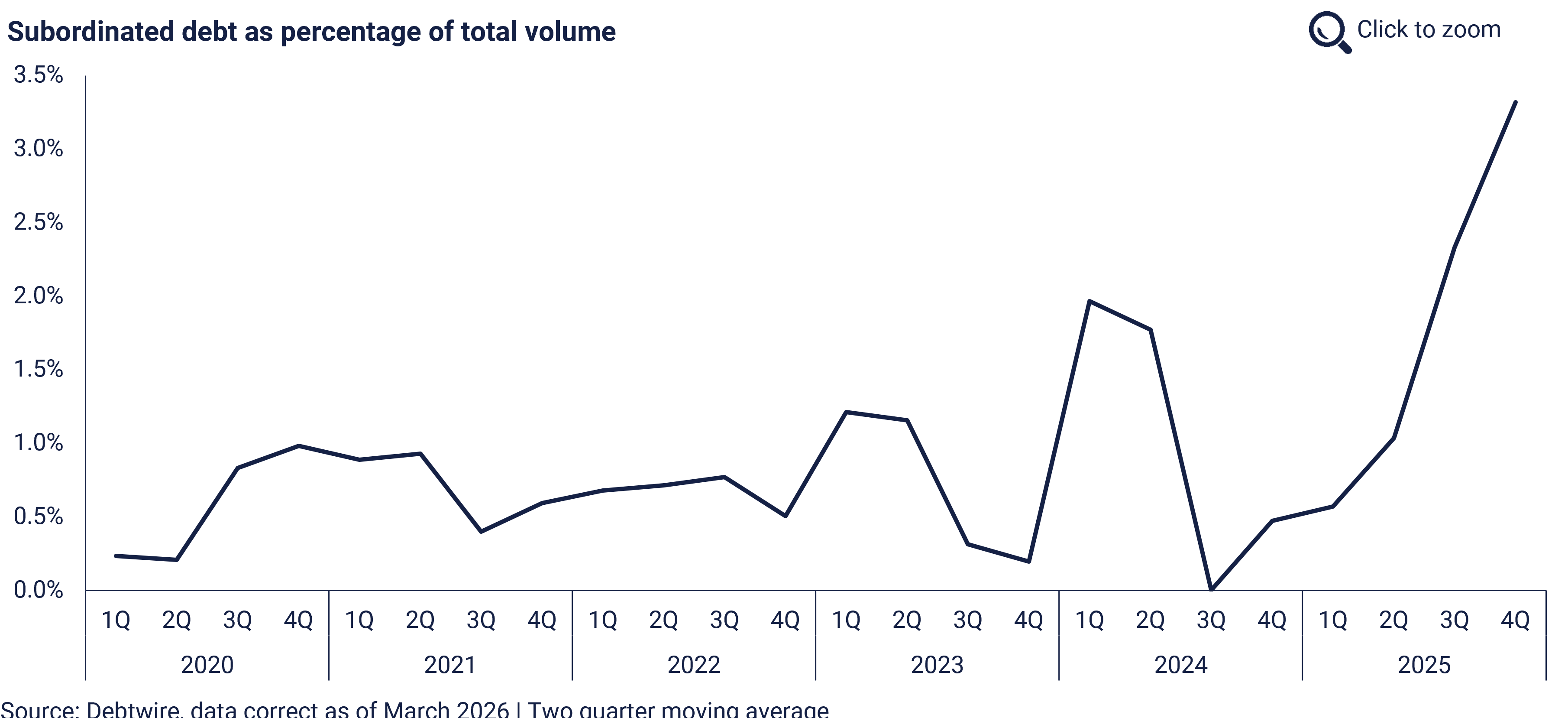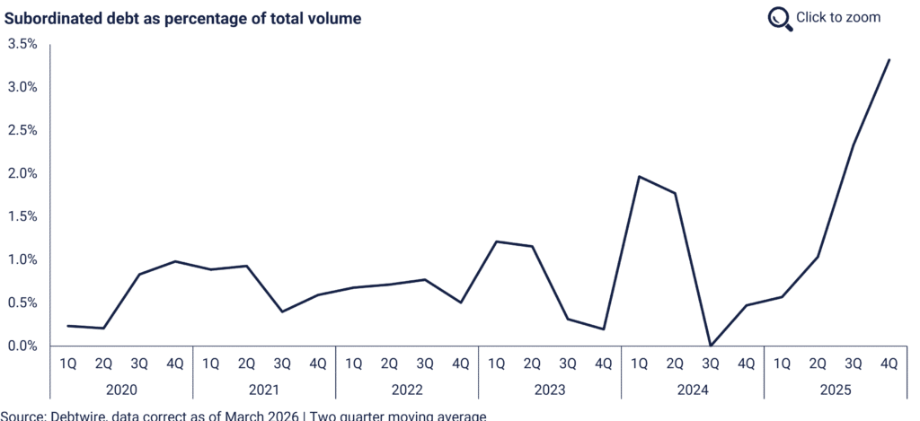 Recent market data from Debtwire indicate elevated activity in subordinated debt markets throughout 2025³. Subordinated bonds saw particularly notable increase in issuance volumes, rising to 3.32% of total volume in Q4 2025 vs. 0.57% in Q1 2025. PIK loans have also surged, accounting for approximately 11% of capital deployed by direct lenders in Q3 2025 – underscoring a broader shift toward flexible, non-cash pay financing structures according to Debtwire.