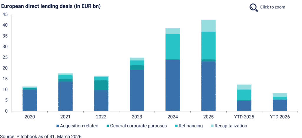 European direct lending volume reached an estimated EUR 8.3bn across 35 transactions in Q1/26, representing a 33% year-on-year volume decline and a 22% volume decline versus Q1 2025. Compared to the same YTD period of 2025, acquisition-related direct lending volume increased by EUR 0.6bn to EUR 5.4bn, while refinancing volume contracted from EUR 4.8bn to EUR 1.3bn. However, market participants point out that a number of transactions have been pending completion since last December.