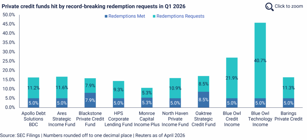 So what is actually happening? The global private credit asset class has grown from roughly USD 300bn in 2010 to USD 3.5tr by end-2024. It is now facing its first real test. Over USD 20bn in redemption requests have hit US based funds, with seven large managers “gating” (or, restricting) outflows², Moody’s revised its BDC outlook to negative, and the sector recorded its first-ever quarterly net outflow. In response, private credit managers have unsurprisingly seen their shares sell off sharply, with leading names down more than 25% (some more than 50% from their peaks).