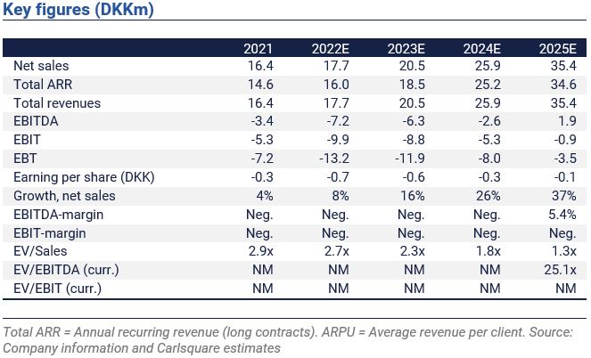 In a base case scenario, a fair value of DKK 3.8 per share (DKK 5.7) is calculated. The downward revision is explained by lower valuation multiples among peer companies and lower revenue forecasts and margin assumptions. Our valuation corresponds to EV/Sales NTM of 4.3x, a 38% discount to the reference group (information systems and SaaS companies). Today, the stock is trading at a valuation of 2.3x our revenue forecast NTM and 3.0x last reported System ARR.