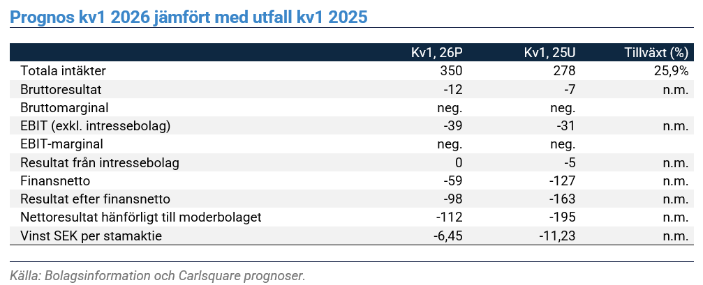Vi räknar med ett sista svagt resultat för första kvartalet 2026 innan ALM Equity byggstartar ett av sina projekt om 357 bostäder i kvarteret Archimedes, i Bromma, Stockholm under andra kvartalet 2026. ALM behöver vissa intäkter från bostadsutvecklingsverksamheten för att kunna täcka sina administrativa overheadkostnader och uppnå ett positivt rörelseresultat.