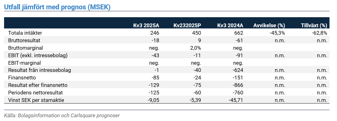 - Nettoomsättningen på 246 MSEK i kv3 2025 blev 45% lägre än vår prognos på 450 MSEK. Entreprenad stod för ca 63% av nettoomsättningen under kv3 2025, medan Utveckling bidrog med 26% och resterande (11%) i huvudsak bestod av intäkter från Förvaltning.