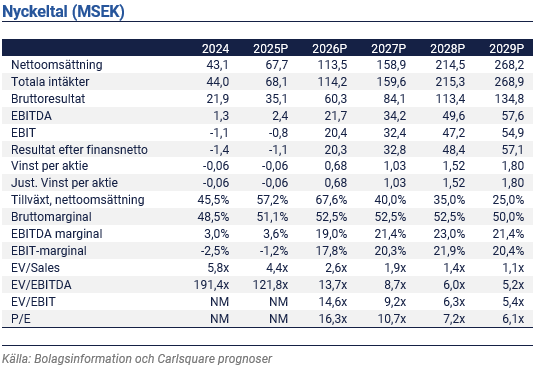 Enrad AB (”Enrad” eller ”Bolaget”) redovisade en nettoomsättning på ca 12,6 MSEK i kv3 2025, vilket var cirka 12% högre än vår prognos om en nettoomsättning på 11,2 MSEK. Bruttoresultatet på 6,6 MSEK motsvarar en bruttomarginal på 52,5%, vilket var högre än vårt estimat om ett bruttoresultat på 5,8 MSEK motsvarande en bruttomarginal på 52%. EBITDA blev minus 0,3 MSEK i kv3 2025, jämfört med vår prognos om minus 0,7 MSEK. Avvikelsen är främst hänförligt till den högre än förväntade omsättningen.  Bolagets kassa uppgick den 30 september 2025 till ca 20,2 MSEK.