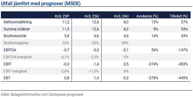- Bruttoresultatet på 6,6 MSEK i kv3 2025 blev ca 14% högre än vår prognos på 5,8 MSEK. Ett bruttoresultat på 6,6 MSEK motsvarar en bruttomarginal på 52,5%, vilket är marginellt högre än vår marginalprognos som var 52%