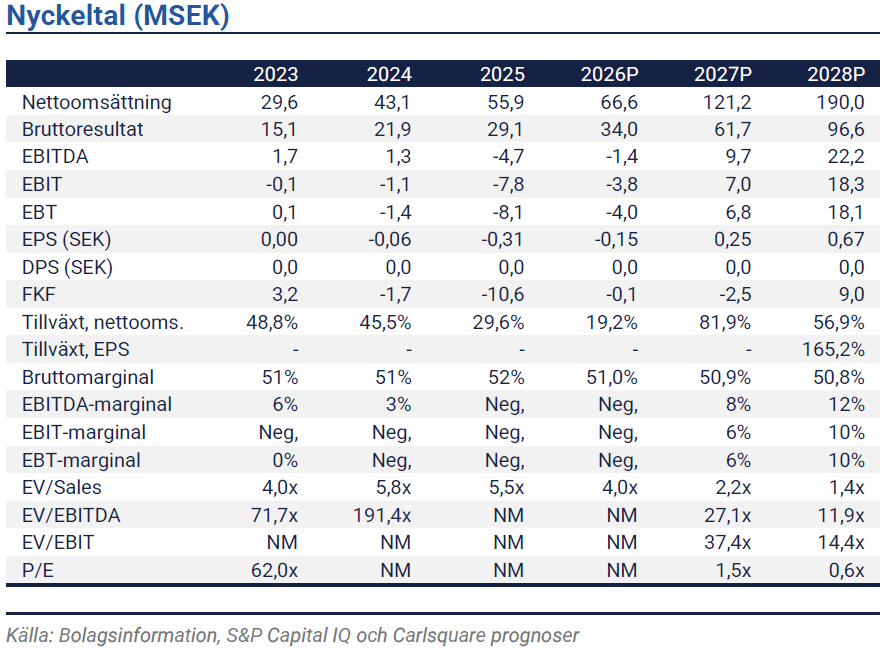 Nettoomsättningen under 2025 uppgick till 55,9 MSEK, +29,6% YoY, men kom in ~7% under vår prognos på 59,9 MSEK. Bruttomarginalen landade på 52,1%, vilket var 2,2 procentenheter över vår prognos på 49,9%. Trots marginalutfallet kom EBIT in svagare än väntat på -7,8 MSEK (vs vår prognos -5,3 MSEK), drivet av omsättningsmissen under kv4 2025. EPS för helåret landade på -0,31 SEK jämfört med vår prognos på -0,02 SEK.