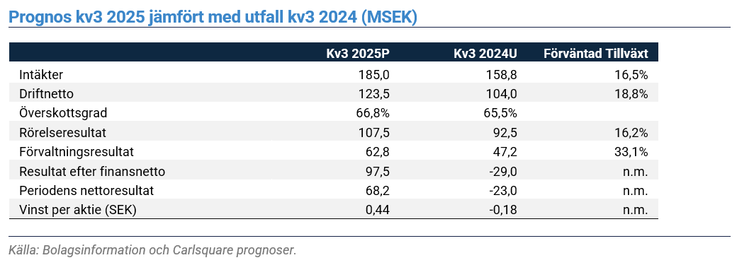KlaraBo AB (”KlaraBo” eller “Bolaget”) publicerar sin kv3 2025-rapport på torsdag den 23 oktober. KlaraBo värderas fortsatt med en substansrabatt på ca 50%, men aktien har ändå tappat mindre än Carnegie Fastighetsindex under kv3 2025.