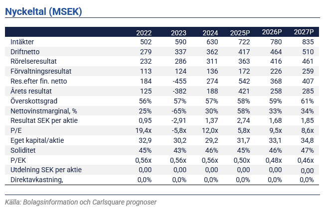 Bolaget redovisade ett driftnetto på 118,7 SEK, jämfört med vårt estimat på 123,5 MSEK. Förvaltningsresultatet blev 56,3 MSEK i kv3 2025, där vår prognos före rapporten var 62,8 MSEK. Det motsvarar en negativ avvikelse på ca 10%.