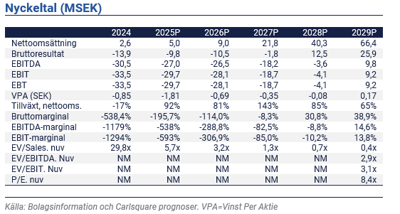 Vid utgången av kv3 2025 uppgick kassan till 15,7 MSEK. Bolaget kommer enligt vårt scenario behöva ta in 25 – 30 MSEK fram tills dess att en lönsamhet har uppnåtts.