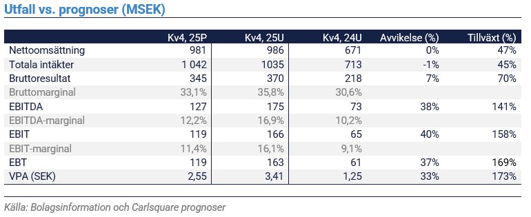 - De totala intäkterna ökade med 45 % under fjärde kvartalet 2025 till 1 035 MSEK, vilket överensstämmer med de preliminära försäljningssiffror som redan offentliggjordes i januari.