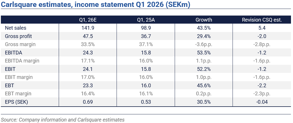 Two areas to watch at the Q1 print are management colour on the pace of gross margin recovery post Q4 2025, and the trajectory of European revenues, which accounted for more than 30% of group sales in February 2026 and continues to build. We have trimmed our Q1 EBITDA estimate marginally to SEK 24.3m (17.1% margin), reflecting a somewhat lower gross margin than previous, tied to an assumed high activity at Lumin4ry. Our estimate still implies 53,5% EBITDA growth YoY, reflecting scalability.