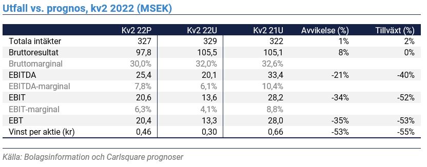 - Dock tyngdes verksamheten av omvärldsfaktorer som inflation inkluderat stigande leveranskostnader. EBITDA-resultatet backade med 40 procent till 20,1 miljoner kronor, motsvarande en marginal på 6,1 procent. Vår uppdaterade prognos låg på 25,4 miljoner kronor motsvarande en marginal på 7,8 procent. Lejonparten av avvikelsen förklaras av högre externa rörelsekostnader än vad vi räknat med.