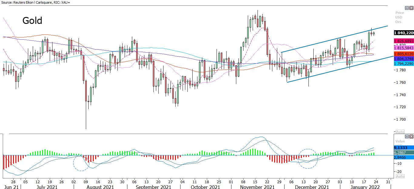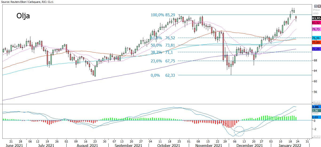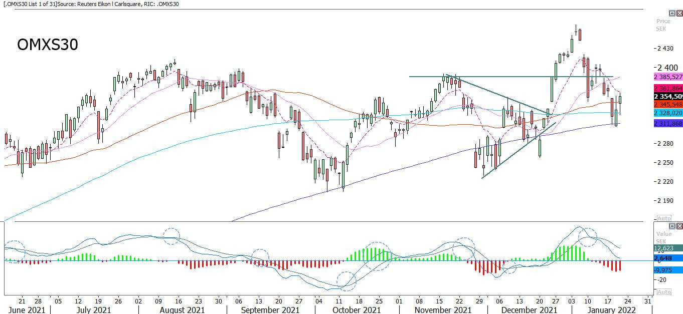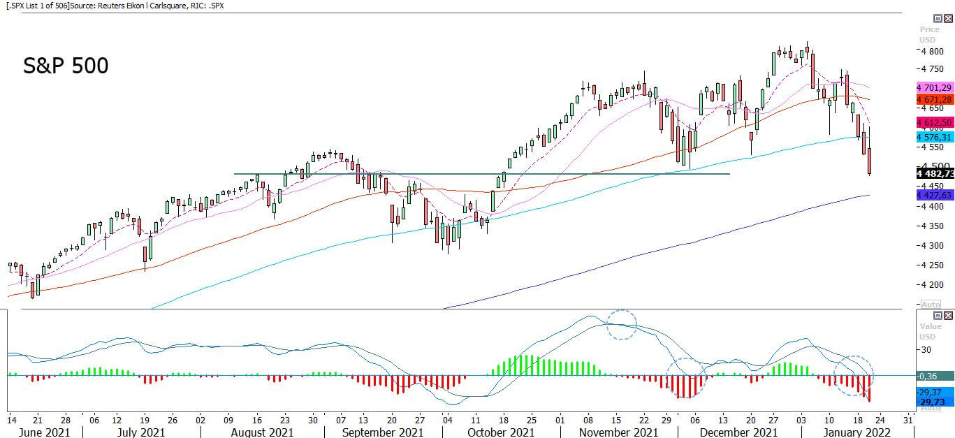 Oro för inflation och hur centralbankerna kommer agera för att tackla denna i form av möjliga räntehöjningar och reducerade balansräkningar fortsätter skrämma investerare. I USA backade breda S&P 500 med 1,1 procent efter att säljtrycket ökat mot slutet av handelsdagen. Som visas i graf nedan har MA100 brutits och indexet ser ut att vara på väg nedan mot MA200 efter att MACD genererat en säljsignal.