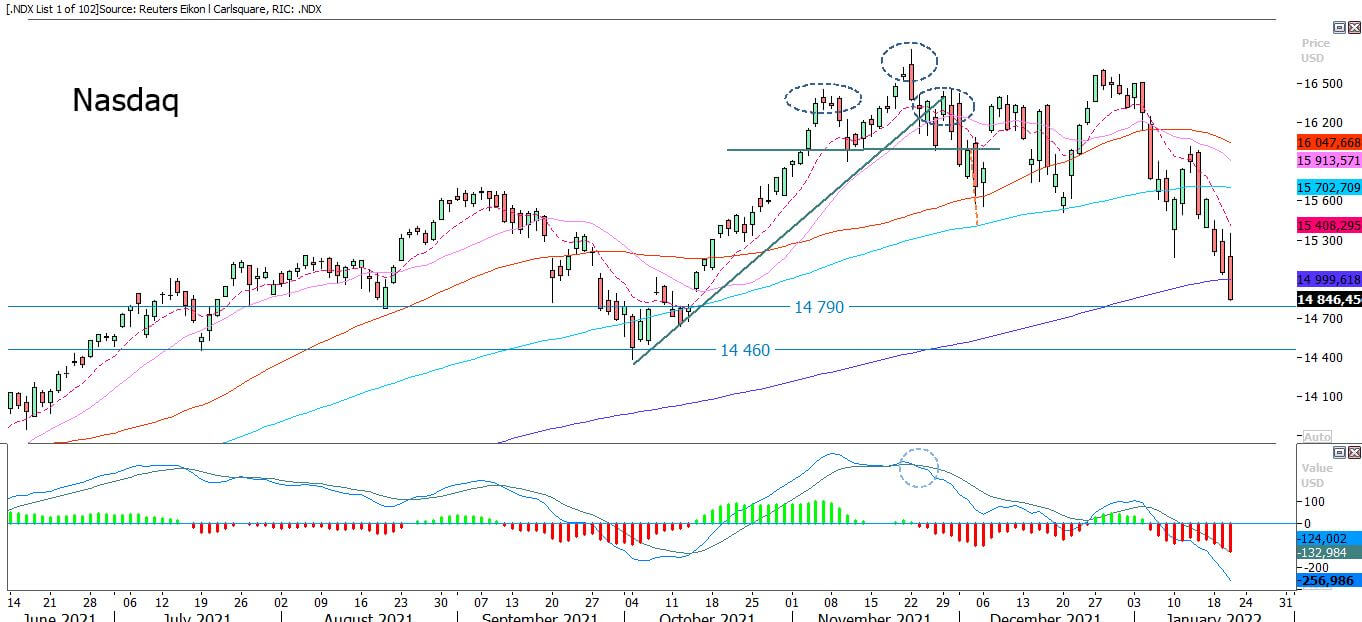 Tech-tunga Nasdaq stängde ned under MA200. Möjligen kan indexet finna stöd runt 14 790: