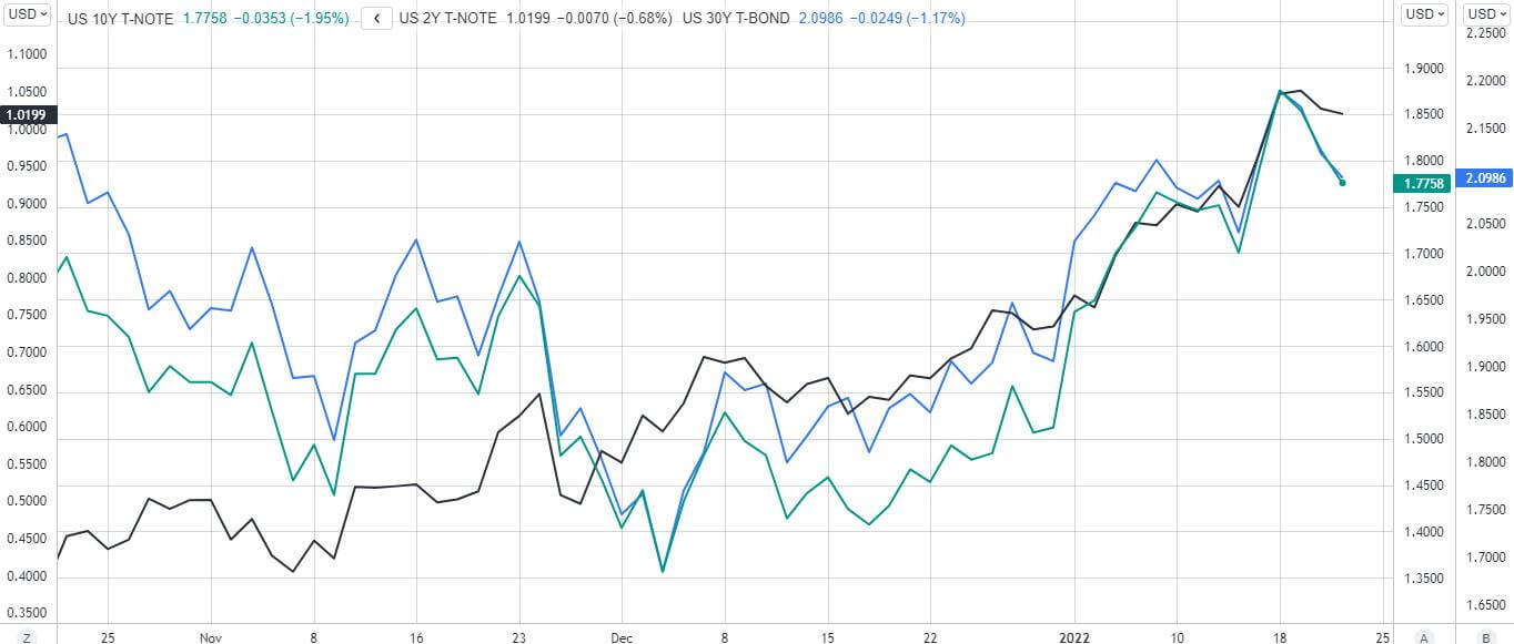 I termer av RSI är både Nasdaq och S&P 500 på översålda nivåer. Detta är inte en köpsignal i sig utan kräver medhåll från annan håll. Kollar vi på räntemarknaden backade både de korta och de långa räntorna i USA under gårdagens handel. Nedgången i räntorna fortsätter även i dag. Se graf nedan. Möjligen kan detta ge stöd till aktiemarknaden.