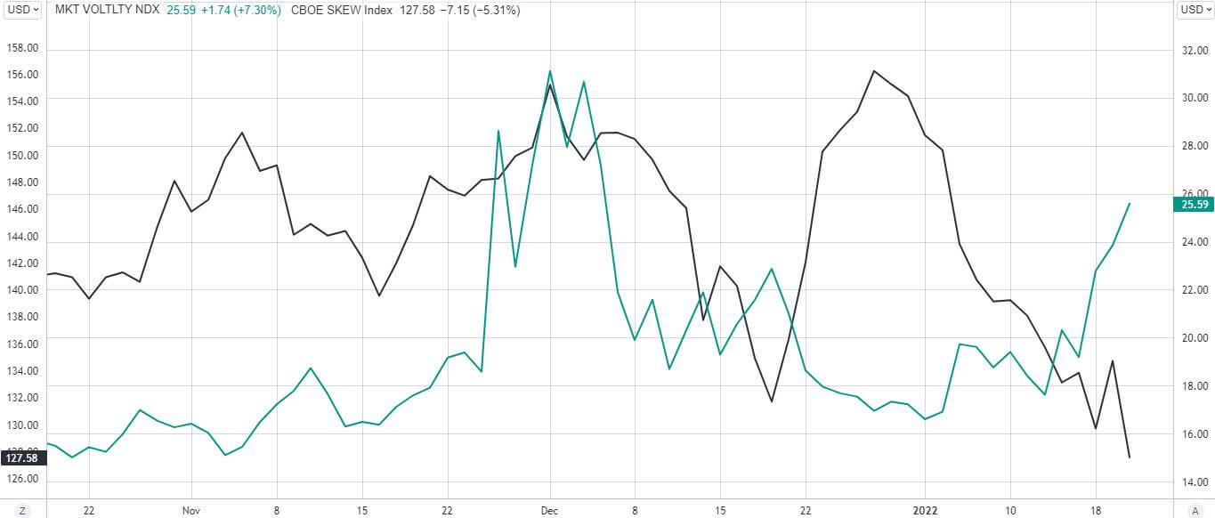 Parallellt har VIX stigit i vanlig ordning med ökad volatilitet på marknaden. Skew index faller dock, vilket innebär att skydd på nedsidan blir allt billigare, då satt i relation till hur uppsidesoptioner prissätts. Det kan tolkas som om att optionsmarknaden ser nedsidan som begränsad.