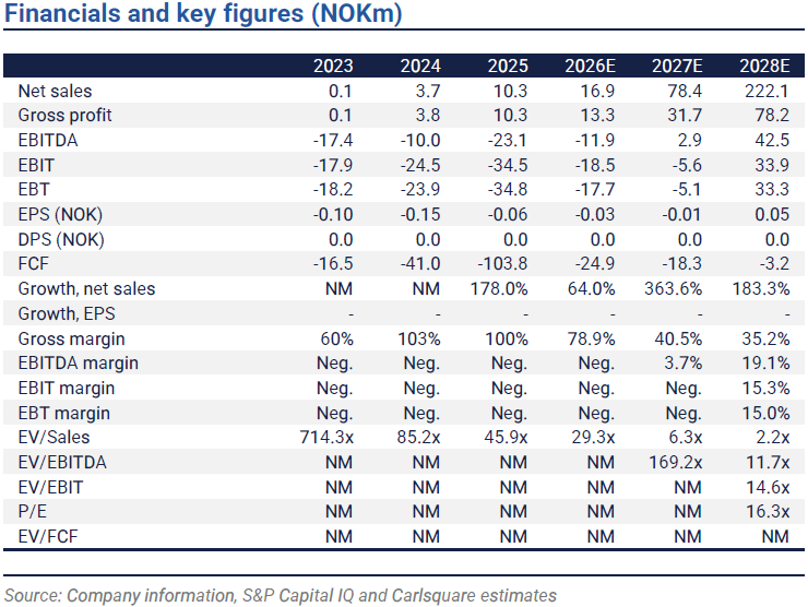 We forecast FY 2026E net sales of NOK ~17m, with just under one third from Hashblade sales, where first deliveries take place in H2. Given leading energy efficiency and potential in, among other areas, a number of AI applications, we assume a sharp ramp in hardware sales in the coming years. In our scenario, the business reaches EBITDA break-even in 2027E and, with strong growth and a scalable model, we see the EBITDA margin trending towards ~19% in 2028E.