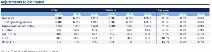 - We lower our estimates in the near and medium term due to sluggish markets, implying a slower market recovery in e.g. Sweden than previously assumed. Also, we have become more cautious on gross margins as we fear inflationary pressure on materials and transport in the wake of the Iran crisis. For example, in 2022, following the Russian invasion of Ukraine, margins in Sweden dropped markedly by 3.4 percentage points (albeit the strong EUR was admittedly likely the main culprit). However, we do not expect as severe an impact this time, and lower OPEX-to-sales in line with company guidance should mitigate margin pressure somewhat.