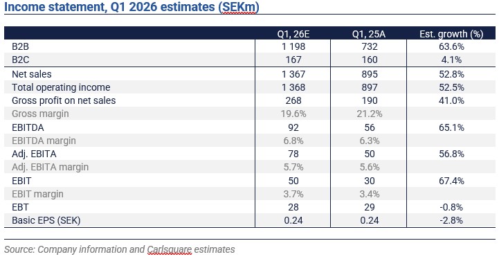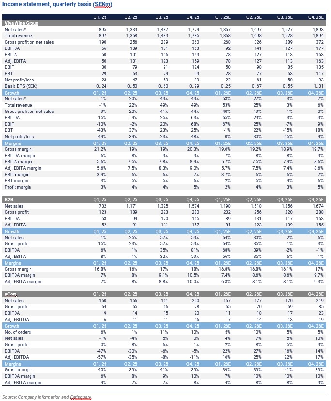 - We expect Q1 2026 net sales of SEK 1,367m (895) boosted by the acquisitions of Delta Wines and Alpha Brands (we estimate ~+54 per cent positive impact). We acknowledge some uncertainty regarding Delta Wines, as we do not have the historical sales for Q1 2025.
