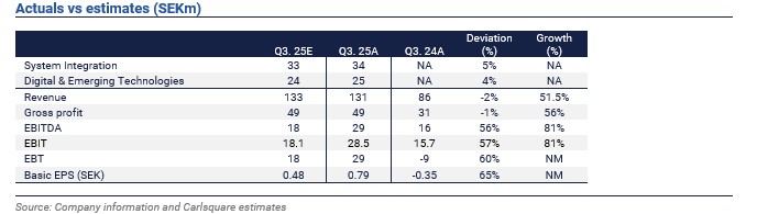 - In Q3 2025, White Pearl Technology Group reported net sales of SEK 131m, corresponding to a 52% growth. Our forecast for the quarter was SEK 133m.